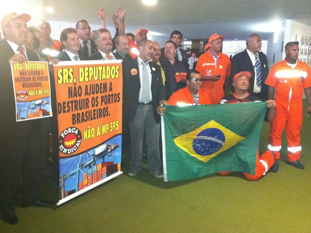 Trabalhadores dos portos protestam contra medida no Congresso (Foto: Felipe Néri/ G1)